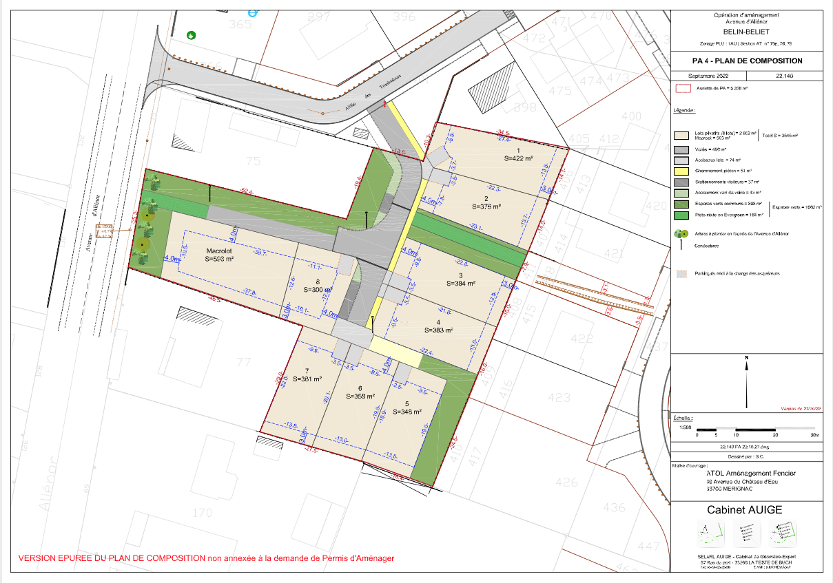 L’impasse Éléonora prend vie à 1km du centre de Belin Beliet et de ses commodités, et à 5min à pied d’un supermarché et des écoles. Les terrains à bâtir de ce lotissement sont vendus reliés à l'assainissement collectif, libres de constructeurs et déjà livrés. Les permis de construire sont déposables immédiatement !