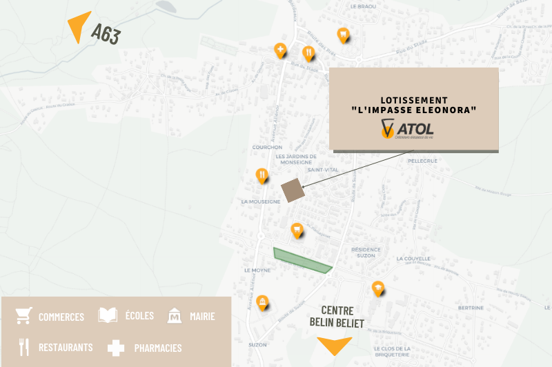 L’impasse Éléonora prend vie à 1km du centre de Belin Beliet et de ses commodités, et à 5min à pied d’un supermarché et des écoles. Les terrains à bâtir de ce lotissement sont vendus reliés à l'assainissement collectif, libres de constructeurs et déjà livrés. Les permis de construire sont déposables immédiatement !